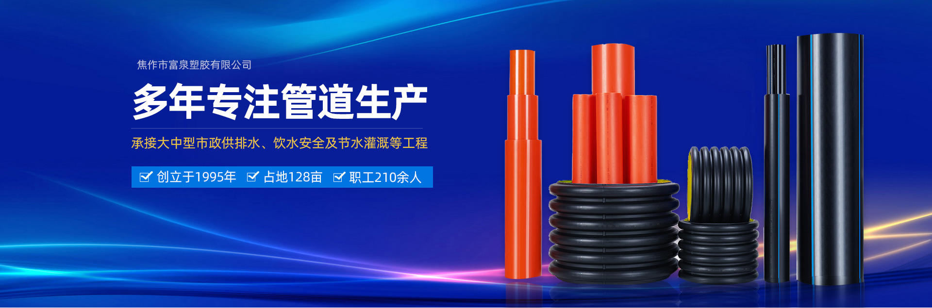 - 焦作市富泉塑胶有限公司,创立于1995年,是一家集研发、设计、生产、销售为一体的大型管材企业。公司位于太极故里、黄河之滨一一河南焦作温县。公司占地128亩,现有职工210余人,其中具有中技术职称的19人。生产、检验设备58台(套),包括PVC实壁管生产线11套、PE实壁管生产线12套、HDPE双壁波纹管生产线6套、PVC双壁波纹管生产线5套,检验设备14台(套)。主要产品有:Φ20mm-630mm、各种压力规格的PVCU、PVC-M、PE给水管材,PVC-U节水灌溉管材,HDPE燃气和矿用管材,DN200-800mm的HDPE、PVC双壁波纹管及各种喷灌、滴灌工程材料。承接大中型市政供排水、饮水安全及节水灌溉等工程?! 「蝗芙汗局厥硬返闹柿俊踩?、环保和节能,在同行业中率先完成了“新华节水产品认证”,全方面通过OHSAS18001职业健康安全管理体系的一体化导入,并建立起规范的现代企业管理体系。公司以“质量”为先导,采用质量跟踪、多环节把关的方法,组建具有行业水准的企业技术检测中心,常年委托水利部节水灌溉设备检测中心、河南省产品质量监督检验院对产品跟踪检测,并由中国人民保险公司承保产品质量。公司连续多年被河南省水利厅确定为“安全饮水设备、节水灌溉设备”定点生产企业,并获得“中国名优产品”“质量、服务、信誉AAA企业”“河南省**产品”“河南省水利企业”“河南省守合同、重信用企业”等荣誉称号?! 「蝗芙汗炯岢帧坝没稀钡姆窭砟?,长期以来,全方面关注客户价值,不断提升服务水平。服务队伍常年为客户的产品设计、施工、安装提供合理的方案和全程细致、周到、**、快捷的技术服务。公司自成立以来,一直坚持以人为本的宗旨,塑造企业形象,并致力于新产品的开发,凭借雄厚的技术开发能力,先进的工艺制造流程,严格的质量管理保证体系,优良的售后服务网络,已成为河南省大的饮水、灌溉及排水管材设备制造商。产品畅销全国,而且还以公司雄厚的综合实力在业界中占据着重要的地位。